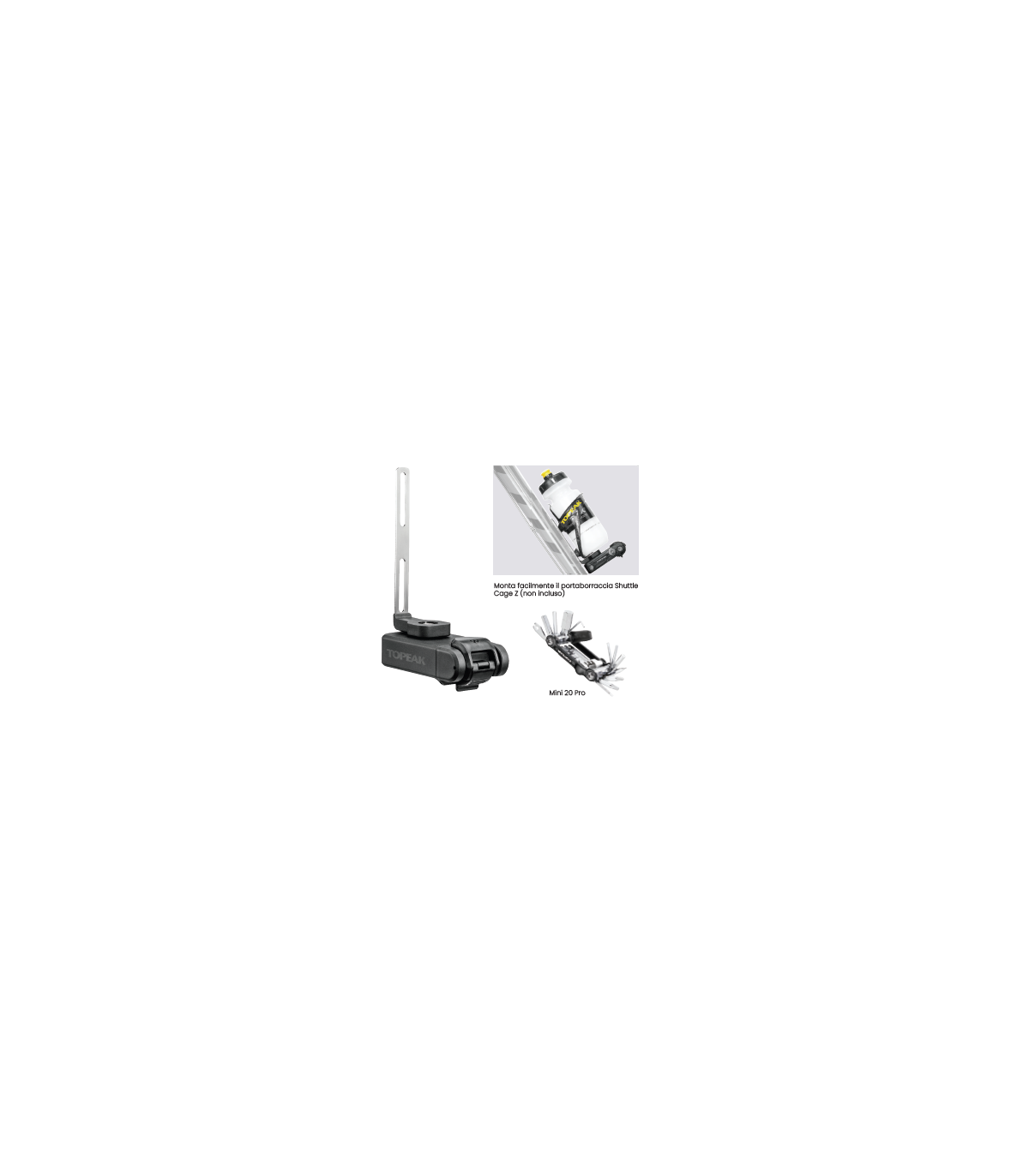 Montare il portaborraccia è semplice grazie a Ninja T Mountain (con custodia fissa incorporata in acciaio e la chiave multiuso. Mini 20 Pro facilmente accessibile) con una semplice torsione.